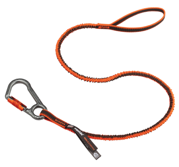 Shock absorbing tool lanyard with locking carabiner on one end and loop on the other end: Designed and tested to prevent falling objects and reduce the force your body sees if a drop occurs by absorbing the energy transmitted through the tool lanyard. By reducing the shock load this design prevents the tool from pulling the user down with it protecting those above as well as those below.